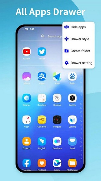 5、应用程序抽屉具有a-z快速查找栏,支持滑动打开/关闭,非常容易找到应用程序