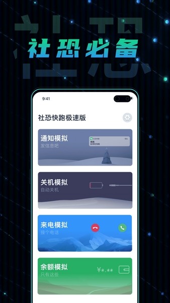 社恐快逃app是一款可以模拟手机上的各种事件的手机软件,可以帮你从各种尴尬的场景中逃脱出来。软件提供了模拟关机、模拟来电和消息,甚至可以模拟余额,能够帮你轻松应对生活中的各种场景,可以巧妙地化解尴尬。此外每个模拟功能都是可以定制的,可以根据需要灵活地改变其内容,从而达到不一样的效果。