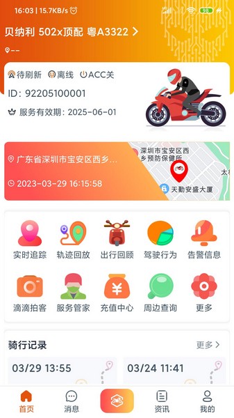 最近我发现了一个挺不错的摩托车管理软件叫突破者APP,感觉挺适合我这种摩托车主的。这个软件的功能真的很齐全,不仅可以实时追踪爱车的位置,还能记录每次骑行的轨迹和状态,简直就像是给摩托车装了个“智能管家”。特别是它的告警功能,比如超速提醒、碰撞报警这些都特别实用,开车的时候多了一份安全保障。