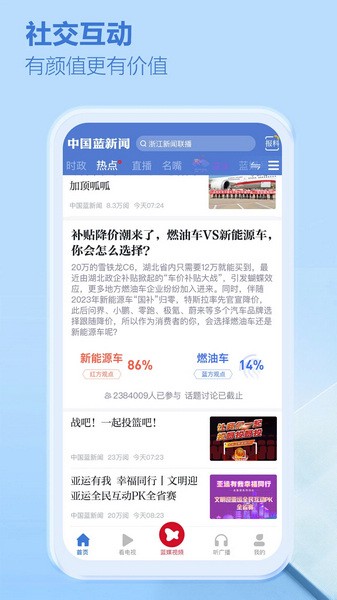 中国蓝新闻APP是浙江广播电视台官方推出的一款新闻资讯软件,整合了浙江新闻资讯、热点视频直播、浙江卫视电视直播等,紧跟实事,为用户提供了高质量的24小时全球资讯,此外还囊括了电视剧、娱乐、体育、文化、汽车等多项分类,满足不同人群的使用需求,搭配简洁清爽的界面及舒适清晰的排版,带来绝佳的使用体验。