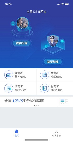 3、绑定后进入全国12315平台界面,点击“个人中心”