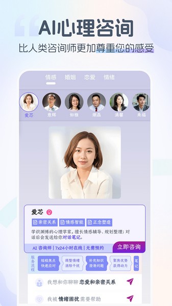 情智星球是一款专用于心理健康咨询的软件。这款软件拥有专业的AI心理咨询功能,设置一个虚拟AI心理咨询师形象来为用户提供咨询相关的服务,用户可以将自己的问题提交给AI,由AI为用户提供建议。软件内的AI咨询师有多种类型,每一位AI咨询师擅长的咨询方向各有不同,用户在咨询前可以查看每位咨询师擅长的方面,再决定选择哪一位咨询师。