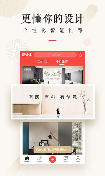 设计本装修是一款非常不错的家居装修和设计软件,不仅能够为设计师们带来更多的室内设计灵感,也可以在家具和装修方面为业主们提供建议。大家只需要输入自己喜欢的风格就能够获得大量的相关装修图片和具有相同审美的室内设计师们,还能够查找各种家具配饰的搭配思路,轻松营造出自己想要的氛围感和生活环境。作为一款入驻了大量专业室内设计师的平台,业主们也能够在设计本装修平台上和设计师进行一对一的沟通咨询。