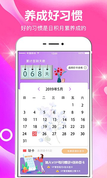 习惯设多种分类,食物、娱乐、学习、心情,运动、休闲、背单词、写作业等常规的分类分类更方便您的选择,您还可自定义签到内容。