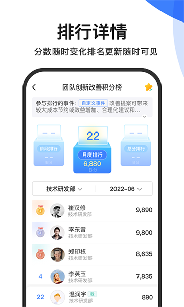 【积分排名】多种自定义分组排名展示模块。积分排名遵循动态公开的原则,分数随时变化、排名随时调整、更新随时可见。利用积分大数据的量化,实现更合理的评价机制。