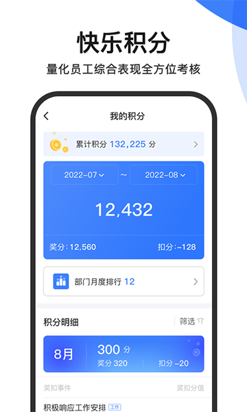 【积分管理】奖扣事件提报模块。积分制管理以奖分为主,大小事件均能做到点对点认可,公司鼓励的用奖分激励,限制的则用扣分提醒。