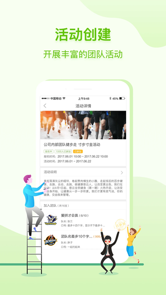 4、团队活动,丰富的健康促进活动,赚积分赢大奖,等你来挑战;