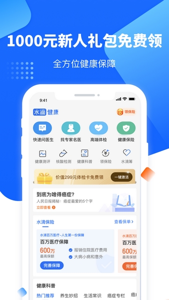 水滴健康APP是一款主打医疗健康保险保障服务的软件,其可为用户提供多种健康管理、保险购买的服务,在这里用户可以在线向各科医生发起咨询,众多三甲医生在线接诊,并支持通过视频、语音、图片等多种形式帮助医生了解患者情况,不出门即可看病,让患者安心疗养!同时更有大量严选保险保障,花小钱保百病,让你无需为看病发愁!