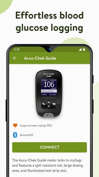 通过蓝牙自动将您的值传输到 mySugr 应用程序,并一键分析它们以更快地识别模式。
