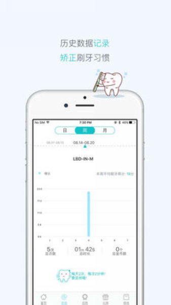 4、刷牙数据:通过每次同步数据可记录您的每次刷牙结果,您可以日、周、月的形式查看自己的历史数据。