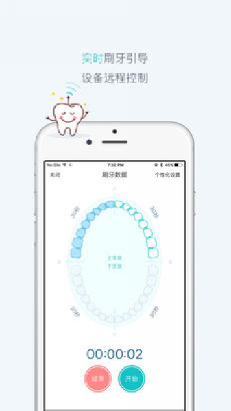1、刷牙提示:可视化的刷牙界面,刷牙分区计时计时提醒,并可在APP上对牙刷进行控制,可帮助您养成科学的洁齿习惯,促进口腔健康,