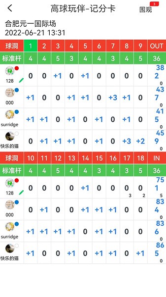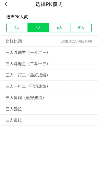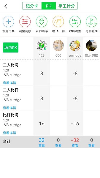 4.支持平时打球时各种娱乐游戏,包括二人比杆比洞、三人斗地主/抢洞、四人拉斯/抢洞等各种各样的娱乐游戏,只要记杆数所有得分自动计算,并可以在线即时直播、分享和围观,即使没有打球也可以分享打球的球友的快乐!