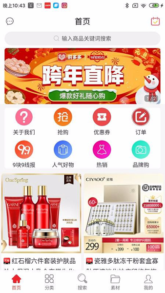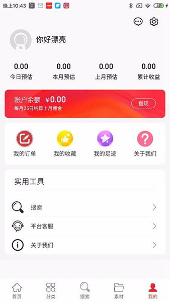 软件功能挺多的,像订单管理、收藏管理这些都很方便,还能看到自己的浏览记录和足迹。最牛的是“一键搜券”,想找到什么优惠券都能直接搜索到!还有余额提现的功能,分享商品赚的钱随时都能提出来用。软件亮点也很多,比如每天都有抢购活动,九块九包邮的商品线报也能及时获取,各种精选好物、热销爆款推荐也都挺齐全的。