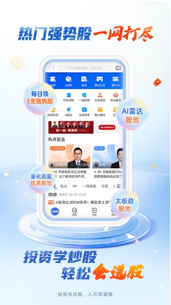 它的特色功能包括AI诊股、多维度评估股票价值;特色策略选股,精准筛选优质个股;量化选股结合大数据分析,确保投资更稳健。最让我觉得实用的是“热股淘金”和“股市情报站”,每天9点更新股池,及时捕捉市场异动和潜在风险。