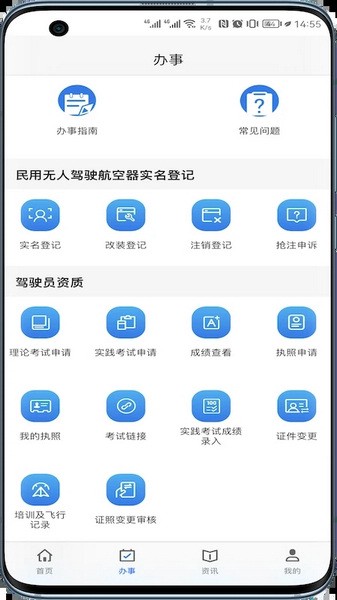 1、软件有无人机实名登记、改装登记、注销登记和申请无人机驾驶执照、电子证照等功能。