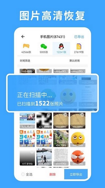 图片恢复:照片恢复、缓存照片恢复、微信聊天图片恢复等。