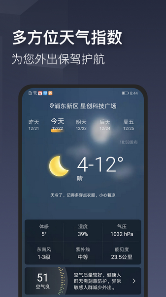 3、贴心的生活助手:多方面生活指数和空气质量指标数据,关注您的穿衣、出行、带伞提醒等多个方面,为您的外出生活保驾护航。