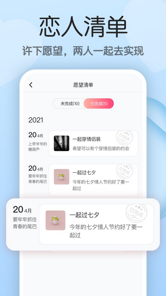 - 愿望清单:恋人清单,许下愿望,两人一起去实现。