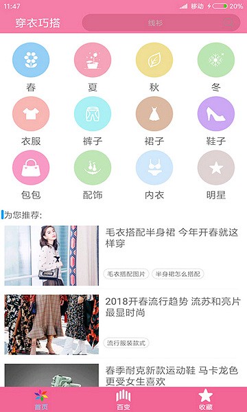 1、首先下载安装并打开软件,首页有各种穿搭资讯,有春夏秋冬四个季节,还有各种种类;