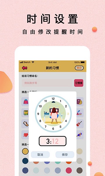 6、自由修改提醒的时间,按时提醒完成打卡,帮助用户养成打卡的规律。