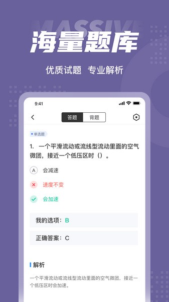 无人机驾驶员题库内含考点练习,全国通用卷以及地区卷模拟练习,以及按照固定考试比重的随机式的抽题的真题考场,成绩单实时记录考试数据,一点一滴的反馈考生近期学习状态以及自我正确率的提升,大大的给予考生通过考试的信心。