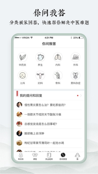 此外,app里还有经典的课程,比如中药、方剂、伤寒论等,用户可以听语音分享或者上传自己的笔记,和其他人交流学习经验。还有一个问答社区,专门为广大中医爱好者和学生提供一个互动平台。