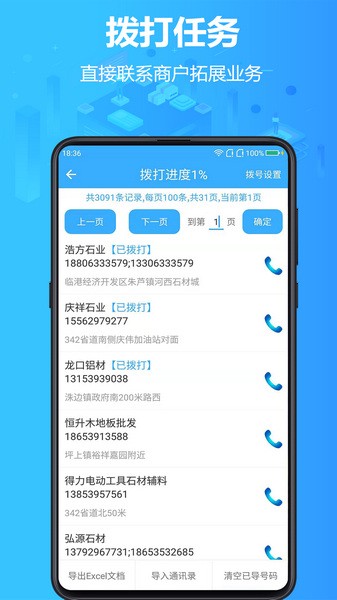 2、拨打进度统计,可导出Excel,可导入通讯录。