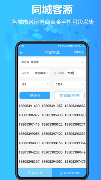 用起来也特别方便,输入筛选条件就能自动匹配符合条件的商户,直接在软件里拨打电话或者把联系方式导入通讯录。还有个“同城客源”功能,专门收集各个城市的靓号和黄金号码段,支持一键导入通讯录和导出Excel,操作起来特别简单。