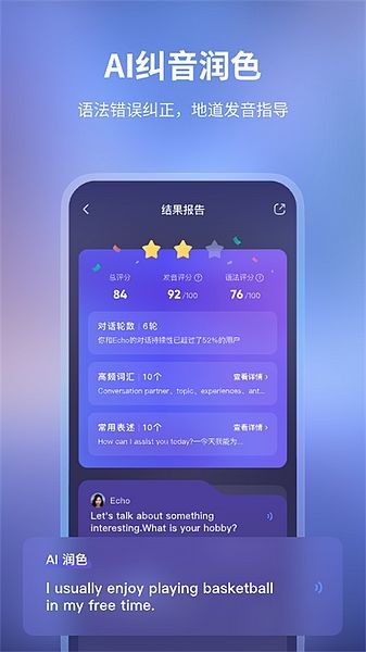 我觉得这个app特别适合社交恐惧症患者,因为它提供了一对一的虚拟练习环境,让用户可以随时随地进行口语训练,完全没有面对面的压力。此外,它还提供详细的分数报告和改进建议,帮助用户快速提升口语水平。