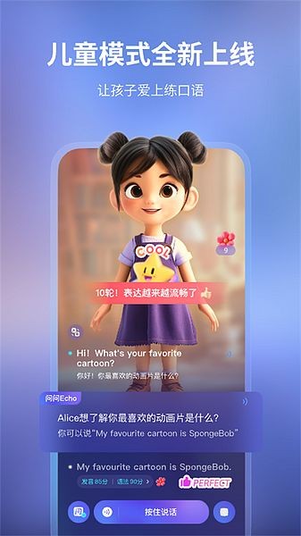 随时随地提供口语对话条件和环境,支持个性化对话引导学习者进行多轮对话,循循善诱,社恐练口语无压力发音标准纯正,地道美式口音。