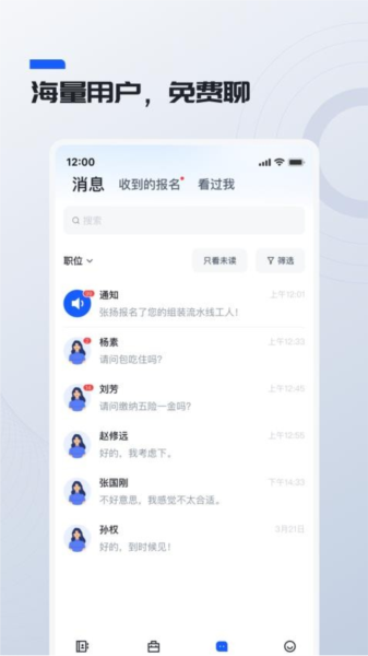鲸才招聘手机版是一个专为企业设计的移动招聘软件,特别适合需要找普工、技术工人等岗位的企业。它提供了发布招聘信息、职位分类、智能推荐等功能,帮助企业快速找到合适的候选人。用户可以在线查看简历、沟通交流,还能安排线下面试,操作简单又高效。