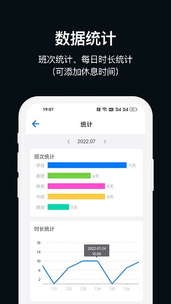 班次统计:支持班次数量统计,班次时长统计、单日时长统计等。