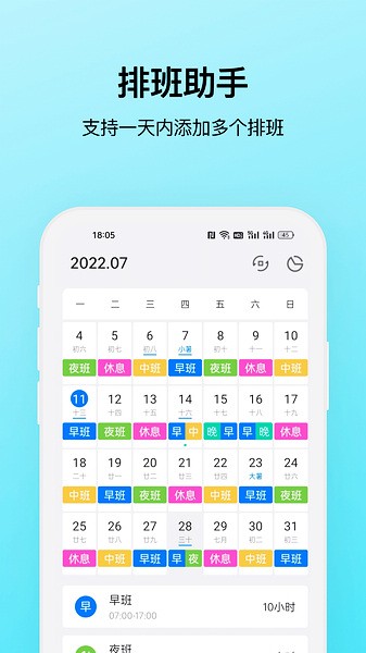 主界面基于月视图日历,清晰展示农历、节假日信息。点击日期即可轻松添加当日班次。默认内置白班、夜班、休息、早班、中班、晚班,您可以随意增加/修改/删除,每个班次都可以自定义班次颜色、上下班时间、休息时间。支持左右滑动切换上下月,也可以快捷跳转自定义的年月。