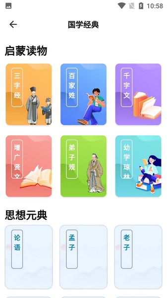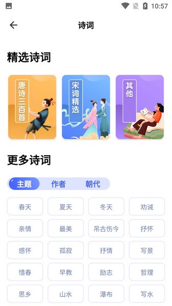 轻松学国文是一款囊括了精选诗词以及三字经、弟子规等启蒙读物等内容的软件,还提供了汉字的字根字源讲解,大家可以在这里掌握更多的语文知识。轻松学国文app使用也非常方便,用户不仅能够根据主题和作者、诗词等对诗词进行查询,大家也完全可以制定专属的学习计划,并领取同步教材来掌握更多的知识点,轻轻松松提高自己的国学素养。