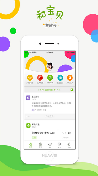 考勤:实时查看宝宝的入园离园信息,放心安全;在线提交请假信息,实时推送。
