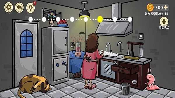 2、接着开启水龙头,把垃圾桶打翻在地,点击陶瓷刀,接着点击开关开启通风口开关,最后点击吊灯就通关啦。