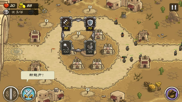 攻略:本关的重点在于死守中央路口,初始布局建议左侧弓箭塔,魔法塔;中下部弓箭塔,炸弹塔;右侧弓箭塔;中部步兵塔,弓箭塔(参考图片一)。有资金后在中部补充1座弓箭塔,1座步兵塔以稳固中央防守,增援还是冷却就用。然后升级,本关的塔可以升1级,优先升级中央的步兵塔,然后是左侧的魔法塔,再后是中央的弓箭塔和中下的炸弹塔。本关二级沙漠兵较多,在其于中央集中时用火雨。后期可酌情在后方补箭塔,总的来说本关难度不大,我通关时还有600多金