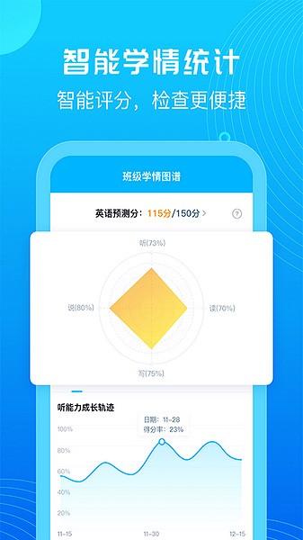 最让我印象深刻的是它的智能学情分析功能。个性化学情图谱能清晰展示学生的薄弱环节,让我更容易制定针对性的教学策略。作文批改功能也很实用,人工智能自动打分加上老师的语音点评,既节省时间又能精准反馈学生的进步。