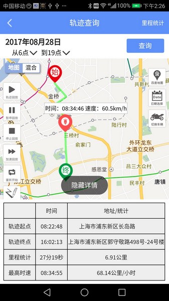 3.轨迹回放:支持回放180天内行车轨迹,回放过程中可显示车辆当时的车速、方向、停留时间等。