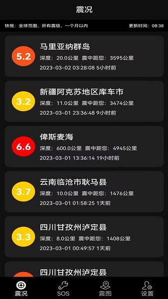 1、实时查询:通过列表和地图的形式展示全球范围内实时地震讯息,可以筛选地震范围、地震时间和地震震级。