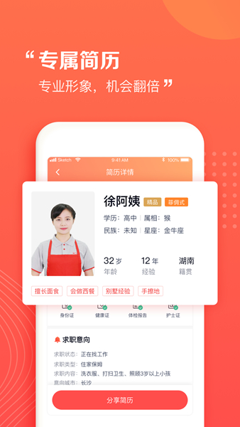 姐妹们可以将自己的个人主页分享给客户,个人主页内容丰富,包括服务口号、个性化标签,认证信息等信息,一目了然,方便客户全方位了解。精彩相册还可以生动展示自己的服务细节,和宝宝的美好时光,雇主反馈的表扬信等,为姐妹们打造一张丰富好看的个人名片。
