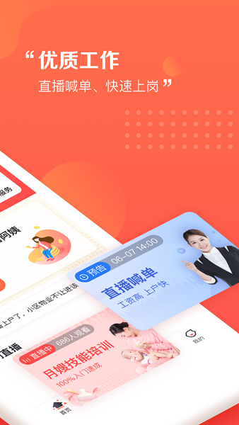 我们拥有大量真实优质订单,阿姨们可以看到雇主发布的需求从而实现抢单,同时我们拥有标准化的免费岗前培训系统,高准度的订单匹配,完善的商户保障体制,完美解除阿姨们的后顾之忧。