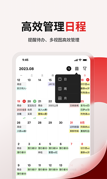 2)【日程管理】多视图查看日程,日、周、月视图随心切换,满足不同使用习惯