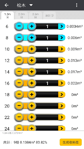 实用的木材行业工具,快速材积计算,材积表查询,可设置不同树种不同长度不同径级的价格,快速计算总价,分类清晰结果明确,可分享计算结果