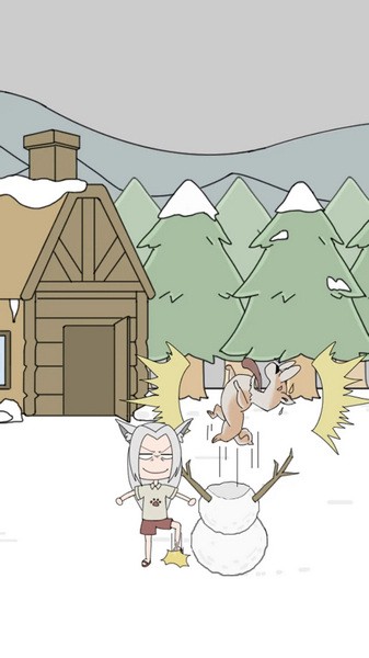 第四关:这关首先要眼疾手快的获取山上正在跑动的雪球,然后在第一场景中获取房子顶上烟墩旁边的雪球以及屋檐下的萝卜和门旁边两侧的树枝,至此去往第二场景获取第三个在左侧树顶的雪球,将获取的全部道具组合放置在场景二中虚线圆内即可;