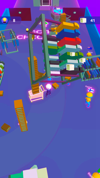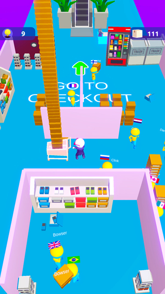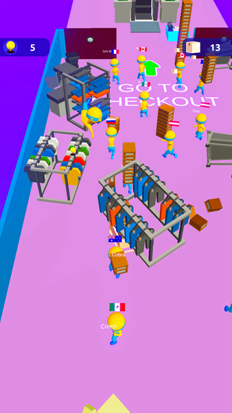 购物大战是一款题材非常新颖有趣的多人对战类手机游戏,在这里玩家可以体验到疯狂买买买的乐趣。游戏中每次比赛都会有很多玩家一起对抗,并且玩家们会分成多个队伍。每个队伍的成员都需要在商场中不断搬运高价值的商品并放在己方区域,时间结束结算时,所有商品加起来价值最高的一方则会获胜。除了一直从搬运外,玩家还可以选择去打乱敌方的搬运计划。带上购物车,戴上你最结实的头盔!清空所有架子,赶在其他人之前去结账;