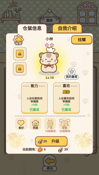 2、打造最温暖的公寓 为仓鼠们打造一座最温暖的公寓,各种不同的房间、不同的家具搭配,让仓鼠们能够更加舒适地生活,还可以让爱好相同的仓鼠同居,触发一系列同居事件