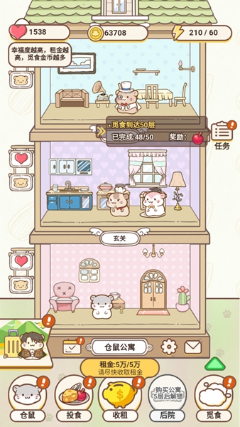 仓鼠公寓破解版无限金币版是一款非常萌趣的经营养成类手游,这里有超多可爱小仓鼠等待你的认领!在游戏中我们可以将房子租给各种可爱的仓鼠,随着入住的仓鼠增多,还有幸福度的增加,我们可以获得更多的租金。然后可以用租金扩建房屋,还可以购买各种装饰来打扮房间。此外还可以给仓鼠喂食,带着仓鼠一起寻宝等多种趣味玩法。1、超萌仓鼠闹翻天70多只造型各异,活泼可爱的Q萌仓鼠在等你,快用奶酪、樱桃和瓜子来吸引他们入住公寓