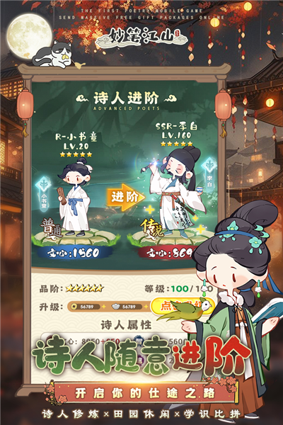 战斗系统也很有意思,需要根据不同的诗词来选择技能,这种设定增加了策略性,玩起来很有成就感。比如用李白的诗提升暴击,或者用杜甫的诗触发击晕效果,每次都能感受到“文化共振”的魅力。