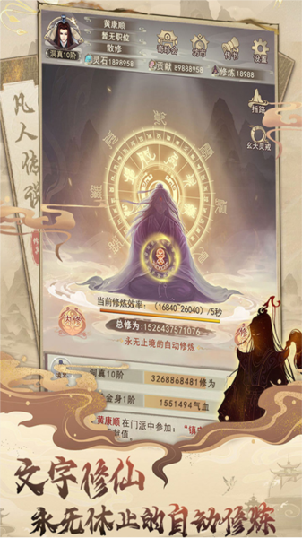 2、文字挂机玩法,完善的游戏系统和更多灵石奖励等你来,随时享受独特的修仙体验。